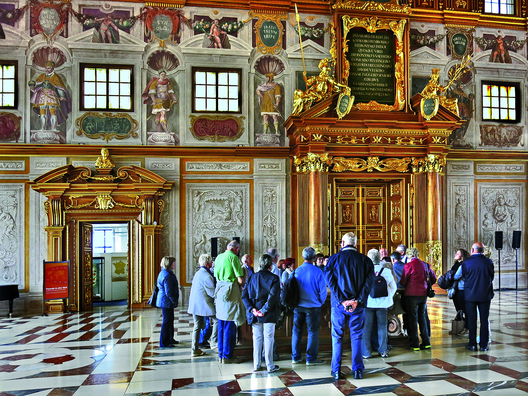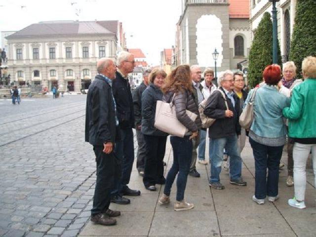 Groß war das Interesse im Jahrgang 44/45 an der angebotenen Fahrt nach Augsburg. Schon bei der Ankunft am Bahnhof in Augsburg, die erste Überraschung. Jahrgangsfreundin Erna Ziegler mit Ehemann Hubert begrüßte die Reisegruppe. Kurz darauf war man dann schon mitten in einer informativen, eindrucksvollen Stadtführung mit der Diplom-Historikerin Frau Leistner-Winkler. Das Stauen begann beim Besuch des Goldenen Saales dessen Saalhöhe mit 14 Meter beeindruckte. Der Saal selbst mit seiner prachtvollen Innengestaltung ist eines der Glanzpunkte der Renaissance in Deutschland. Seinen Namen bezieht er von dem reichhaltigen Goldschmuck der seine Einrichtung ziert.