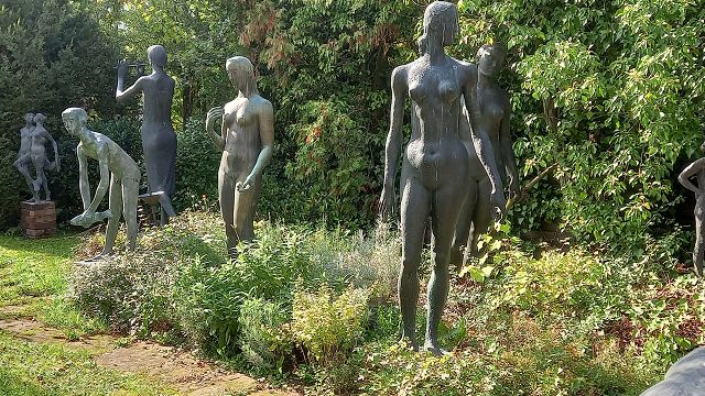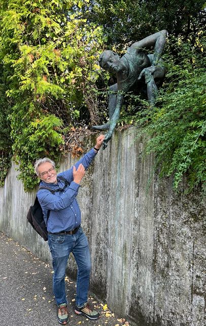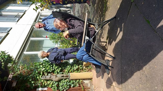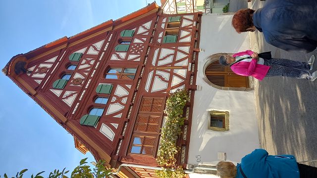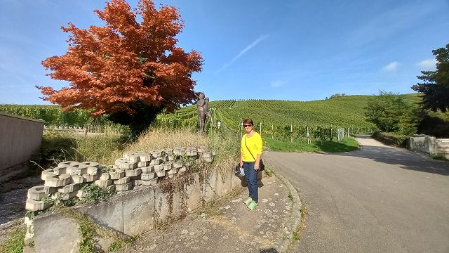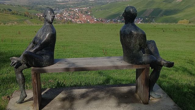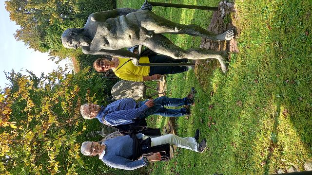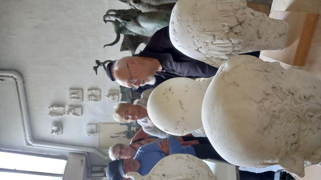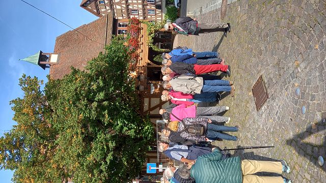 In bester Erinnerung wird die „Entdeckungsreise“ nach Strümpfelbach bei den Teilnehmern des Jahrgangs 44/45 bleiben. Bei herrlichem Sonnenschein konnten Werner Lorch und Norbert Krum die große Reisegruppe im Remstal herzlich willkommen heißen. Gästeführerin Marliese Mannschreck zeigte in einem Rundgang die Besonderheiten des zwischen Weinbergen und Streuobstwiesen romantisch gelegenen Ortes Strümpfelbach auf. Hier sind besonders erwähnenswert die rund 80 prächtigen Fachwerkhäuser, die die engen Straßen und Gässchen säumen. Auf den Höhen des Schurwaldes liegt das Naturfreundehaus. Nach dem Essen war der Ausblick weit in Rems- und Neckartal etwas zum Genießen. Hier waren auch die ersten Arbeiten aus der Künstlerwerkstatt Nuss zu besichtigen. Die besonders beeindruckende Darstellung von zehn „Paaren“ machte manchen der Betrachter doch so neugierig, dass man die Kunstwerke mehrmals „umrundete“, um ja alles zu entdecken. Der Höhepunkt dieser Ausfahrt war sicherlich der persönliche Kontakt mit dem Künstler Prof. Karl Ulrich Nuss selbst in seinem „Gärtle“ und Atelier. In seiner sehr sympathischen Art berichtete er über sein künstlerisches Schaffen und Wirken. Ja, und dann kam man aus dem Staunen beim Betrachten einer enormen Vielzahl großer und kleiner Bronzefiguren nicht mehr heraus. Der Künstler selbst war mitten unter der Gruppe und gab Hinweise warum und weshalb sein Werk manchmal auch recht freizügig ausgestaltet ist. Angeblich soll es im Wein sieben Weingeister geben. Diese zu entdecken war die Aufgabe beim gemütlichen Abschluss im „Schmiegs Rems Besen“. Es war nicht ganz einfach, und so hieß es doch wiederholt: Darum, mein Freund, zum Mund das Glas! Lass uns den Wein, das edle Nass probieren und darin die Geister spüren. Die gute Stimmung an diesem Abend, lässt darauf schließen, auch diese Geister wurden auf dieser „Entdeckungsreise“ spürbar gefunden.
