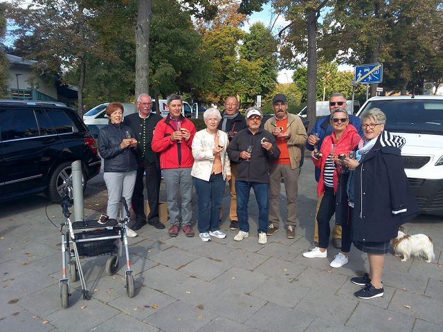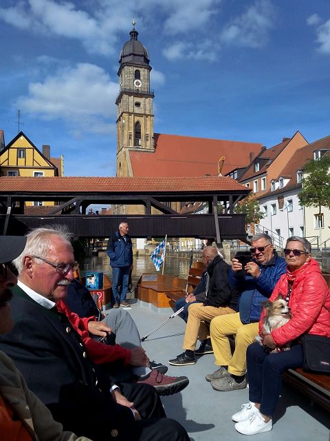 Eine Delegation unseres Jahrgangs folgte gerne der Einladung von Karin und Wolfgang Eger zu einem Besuch von Amberg. Mit einem Sektempfang und dazu die passenden Namens-Törtchen startete man in einen erlebnisreichen Tag. Die Stadtführung zeigte Amberg mit seinem mittelalterlichen Charme und gleichzeitig auch der Weg in ein modernes Zentrum auf. Dabei gab es viel zu schauen und zu staunen. Wahrlich eine kleine „Architekturreise“. Typische fränkische Schmankerl gab es zur Mittagszeit im „Rauchwurm“. Im Anschluss ging es mit einer unterhaltsamen Plättenfahrt auf der Vils weiter im Programm. Keiner der Teilnehmer wusste so richtig, was eine Plätte ist?? Hier die Auflösung: Ein solcher Kahn diente früher dem Transport von Erz auf der Vils. Die Fahrt mit dem Kahn führte durch das ehemalige Gartenschaugelände und dem mächtigen Wassertorbau, der sich in Bögen über die Vils spannt und durch Wasserspiegelungen eine überdimensionale Brille erspiegelt, das Wahrzeichen der Stadt: Die Stadtbrille. Am Nachmittag ging es aufs „Land“ nach Wolfsfeld, dem Wohnort von Karin und Wolfgang. Hier wurden die Giengener von den beiden Jahrgangsfreunden mit Kaffee und Kuchen verwöhnt. Dabei wurden so manche Erinnerungen an Schul- und Jugendzeit ausgetauscht.