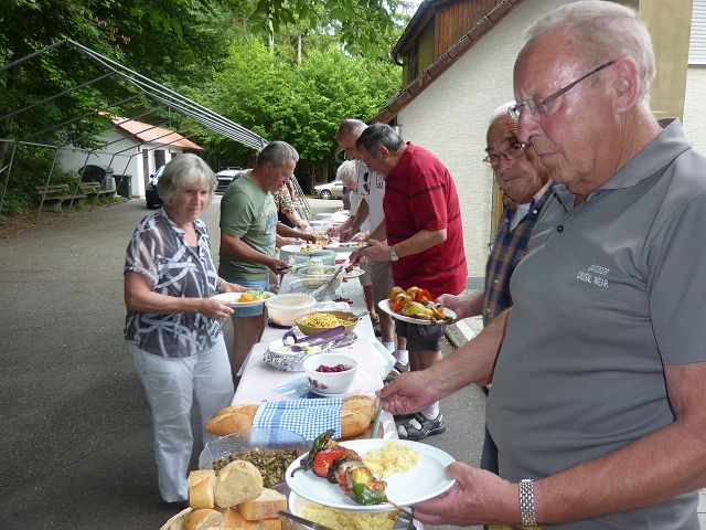 Ein warmer Sommerabend, bestens gelaunte Besucher und der vortreffliche Grillmeister Jürgen waren die optimalen Voraussetzungen für einen gelungenen Abend beim Jahrgang 44/45. Für das Teammitglied Heide begann das Treffen im NaturFreundehaus „Hasenloch“ mit einer Überraschung. Sie durfte erstmals den neu geschaffenen „Schwarzwurstorden am blauen Band“ für ihre Mitarbeit umgehängt erhalten. Der als „Brasilo“ angekündigte Überraschungsspieß war der Renner.