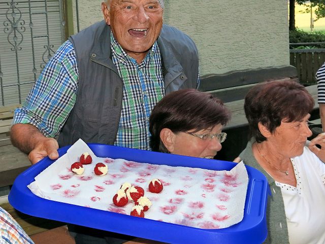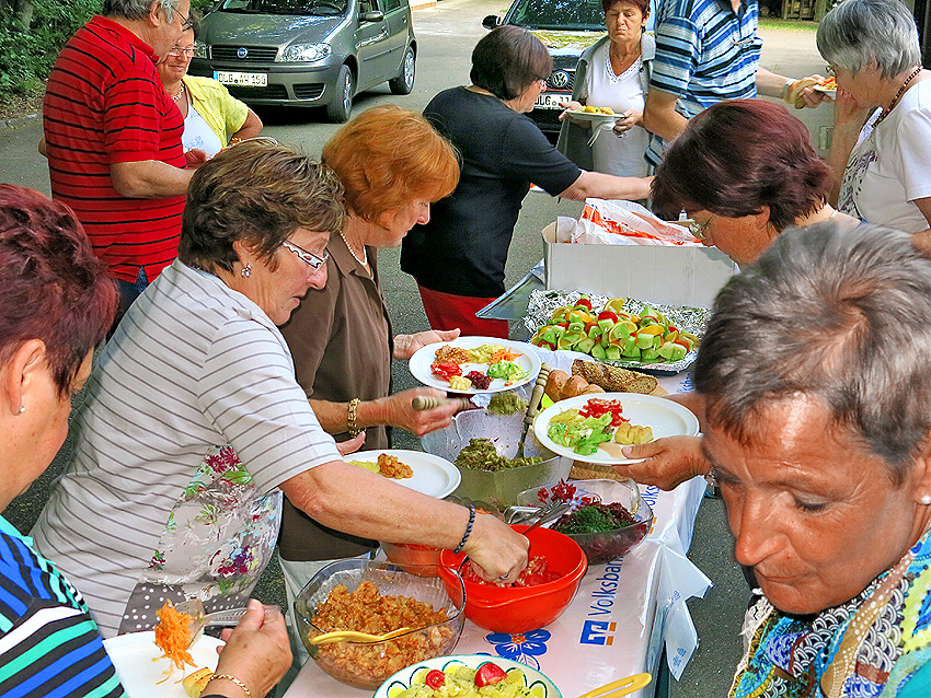 Gut gelaunte, zahlreiche Teilnehmer. Der freundliche, hilfsbereite Hausdienst der Naturfreunde. Ein strahlender Sonnentag mit einem lauen Sommerabend. Dazu ein hervorragend aufgelegter Grillmeister Jürgen. Was wollte man noch mehr? Ja richtig, nicht zu vergessen das hervorragende Salatbüfett, hier ein kurzer Blick darauf. Da war er wieder, der scharfe Kartoffelsalat von Karl. Von der roten Beete bis zum herrlichen Möhrensalat waren im Angebot. Ende gut? Nein, da war noch der raffinierte Nachtisch von Babs, denn man musste mit dem Löffel weit nach unten gehen um die Besonderheit dieser Köstlichkeit zu erreichen.