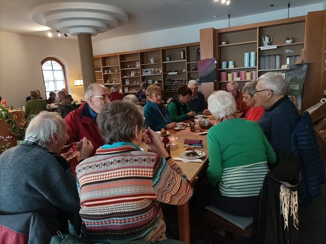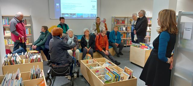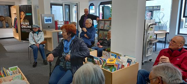 „Es ist schon bemerkenswert, welche wertvollen Informationen man auf dieser kurzen Wegstrecke erhält“. So die Feststellung eines Teilnehmers beim Spaziergang des Jahrgangs 44/45 auf der „Marktgass“! Erstes Ziel der großen Gruppe war die neue Stadtbibliothek. Hier informierte die Leiterin, Frau Daniela Galter, ausführlich über die neue Qualität und den besonderen Service dieser städtischen Einrichtung. Die Stadtbibliothek, als ein Ort der Information und Begegnung, wird mit einem Medienbestand von über 20.000 Medien dieser Aufgabe gerecht. Zu erfahren war, dass der Kinderbereich sehr gut mit den verschiedensten Medien ausgestattet ist, für den Jugendbereich sind jedoch noch einige Wünsche offen. Neugierig ging es einige Häuser weiter, zum „Kleiderglück“, eine Einrichtung des Deutschen Roten Kreuzes. Durch die immer sehr gelungene Schaufensterdeko kannte man das Geschäft. Doch erst ein Rundgang veranlasste bei vielen Teilnehmer die Erkenntnis: „Des hätt i nie denkt“. Frau Angela Zell, Koordinatorin für Soziale Projekte beim DRK, Heidenheim war es, die die Gruppe über die umfangreichen Arbeitsschritte, die die Kleiderspenden erfordern informierte. Ja, es ist wahrlich ein Glück, dass wir eine solch soziale Einrichtung in der Stadt haben mit vielen ehrenamtlich arbeitenden Mitarbeitern. Ein gelungener Abschluss war der Besuch des Cafè „Lieblingseck“. Dort wurden wir bestens bewirtet und freundlich bedient. Neben der Diskussion über das heute Erlebte war noch Zeit, sich am Osterrätselspiel des Jahrgangs zu beteiligen. Fazit: Unsere „Marktgass“ hat was für sich!